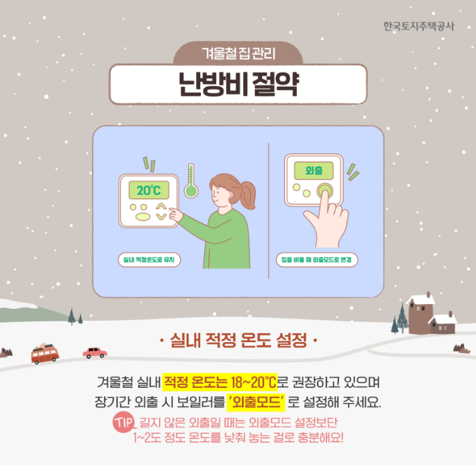 보일러를 사용하는 가정이라면 난방을 완전히 끄기보다는 외출 모드를 활용하는 것이 좋습니다. 외출 모드는 실내 온도를 낮게 유지하면서도 배관 내부의 온도가 일정 수준 이하로 내려가지 않도록 설계된 기능입니다. 난방비를 아끼겠다고 보일러를 완전히 끄는 경우, 오히려 동파 위험이 커질 수 있다는 점을 기억해야 합니다.