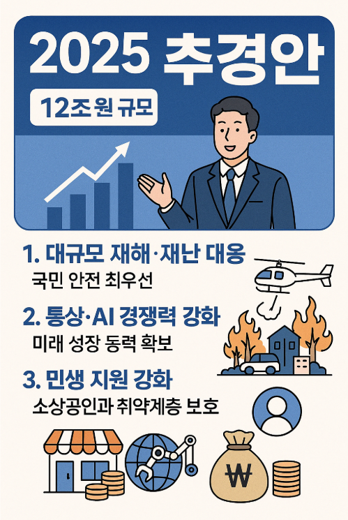 이번 12조 원 규모의 필수 추경안은 재해·재난 대응, 통상·AI 경쟁력 강화, 민생 지원 등 세 가지 핵심 분야에 중점을 두고 있으며, 이를 통해 국민의 안전을 확보하고, 경제 회복과 미래 성장 동력을 확보하려는 정부의 노력이 엿보입니다. 앞으로 국회의 협조를 통해 추경안이 신속히 통과되어 국민의 삶에 실질적인 도움이 되기를 기대합니다.
