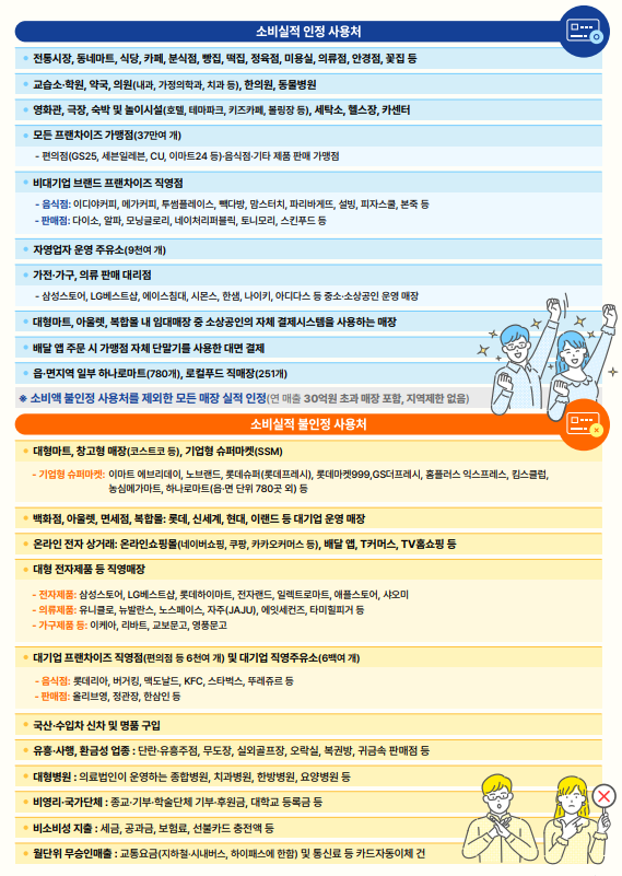 | 제외 소비처 | 백화점, 대형마트, 온라인 쇼핑몰, 일부 대형 전자매장, 유흥업종 등은 실적 인정 대상에서 제외됨 |