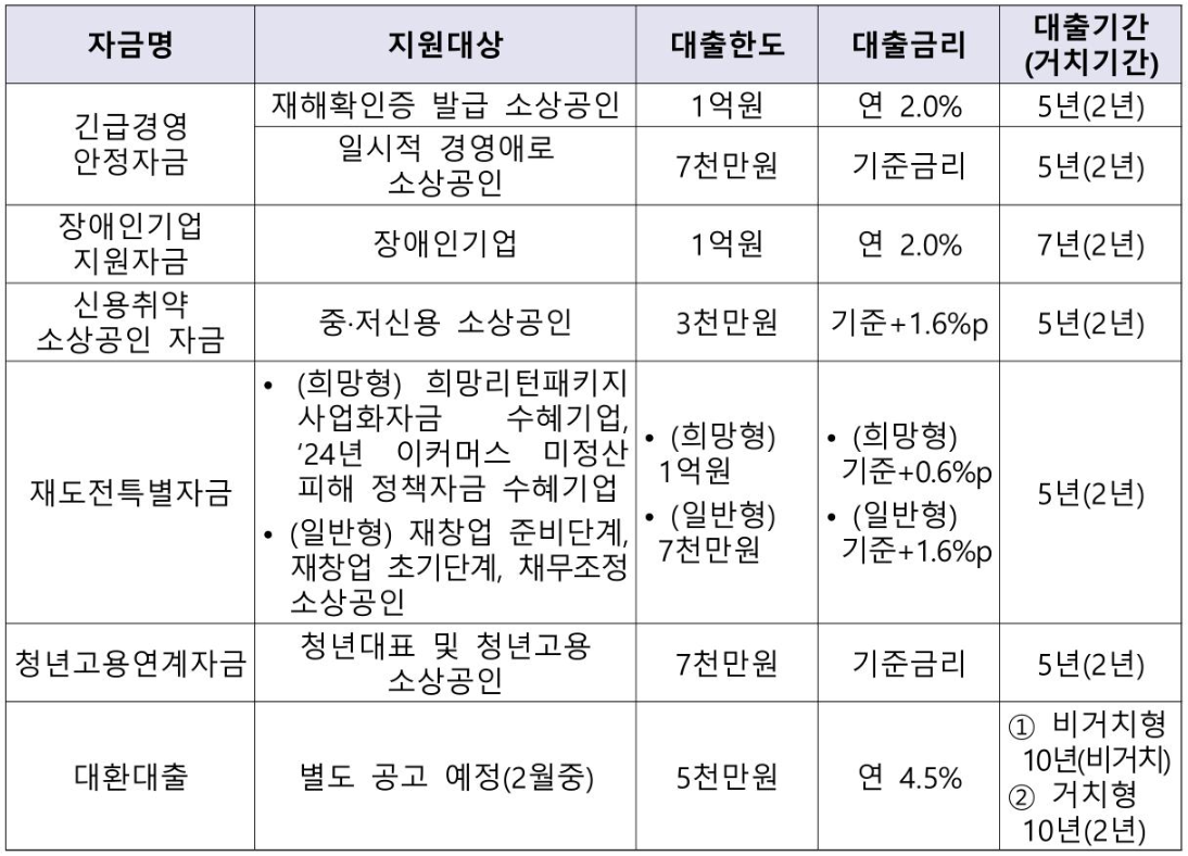 - 목적: 경기침체, 재해피해, 금융소외계층(저신용자, 장애인기업), 청년 사업자 지원