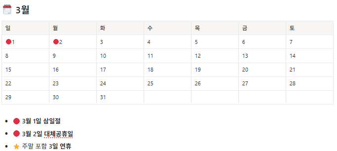 | 3월 | 삼일절 (3/1, 일) + 대체공휴일 (3/2, 월) | 3일 연휴 |