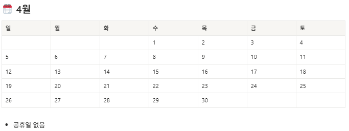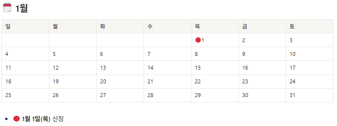 | 1월 | 신정 (1/1, 목) | 1일 |