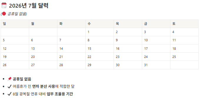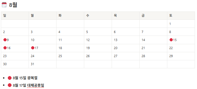 | 8월 | 광복절 (8/15, 토) + 대체공휴일 (8/17, 월) | 3일 연휴 |