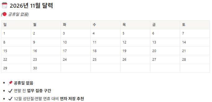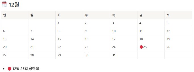 | 12월 | 성탄절 (12/25, 금) | 연말 연휴 시작 |