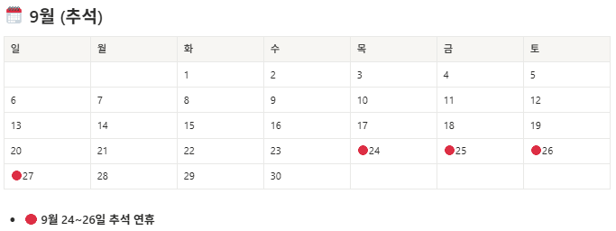 | 9월 | 추석 연휴 (9/24~26, 목~토) | 주말 포함 시 다양 |