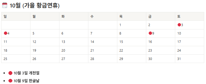 | 10월 | 개천절 (10/3, 토) / 한글날 (10/9, 금) | 3~4일 연휴 |