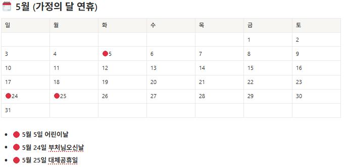 - 5월 초 어린이날 연차 → 5일 이상 연휴