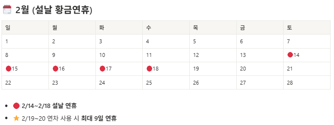 | 2월 | 설날 연휴 (2/14~18, 토~수) | 주말 + 설날 연휴 |