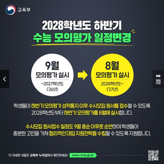 또한 수시·정시 모집 시 모의평가와 원서 접수 시점도 조정됩니다. 수시 원서접수는 2028학년도부터 9월 중순 이후로 순연되며, 이에 따라 모의평가도 9월이 아닌 8월 중으로 앞당겨 실시됩니다.