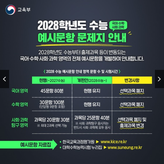 - 변경사항: 반드시 사회 1과목, 과학 1과목 각각 응시 필수 / 선택과목 폐지로 모든 학생이 같은 과목을 응시함