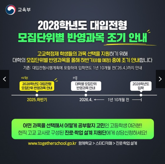 고교학점제에 따라 과목 선택의 폭이 넓어진 상황에서, 어떤 과목을 어떻게 선택할 것인가가 입시에 큰 영향을 미칩니다. 이에 교육부는 2028학년도에 지원할 수험생을 위해 대학별 모집단위별 반영과목을 2025년 8월 조기 공개할 예정입니다.