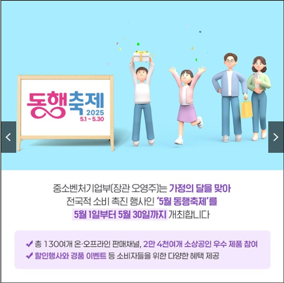 '동행축제'는 내수 활성화와 중소기업·소상공인의 판로 확대를 목적으로 매년 개최되는 전국 단위의 소비 촉진 행사입니다. 2025년 5월에는 130여 개의 온·오프라인 판매 채널과 2만 4천여 개의 중소기업 제품이 참여하여, 소비자들에게 최대 30%의 할인 혜택을 제공합니다.